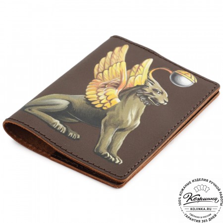 Этот купюрник в три сложения закрывается на хлястик с кнопкой. Внутри распологаются: откидное отделение для купюр и три кармана для карт.
