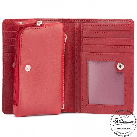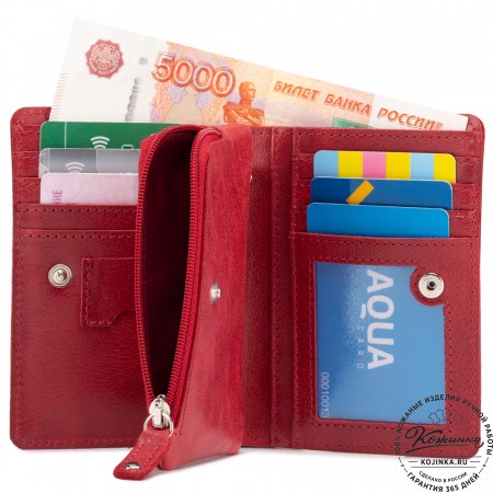 Эта модель очень функциональна - множество отделений позволяет удобно расположить большое количество кредитных карт и купюр, а также водительское удостоверение. Дополнительный отсек для мелочи. Портмоне закрывается на язычок с кнопкой.