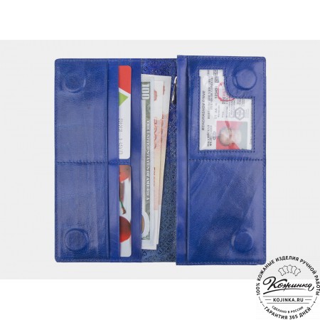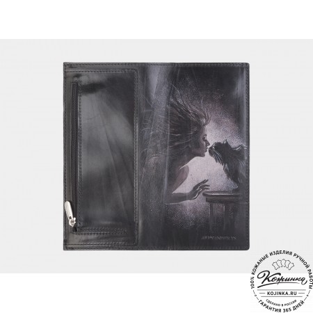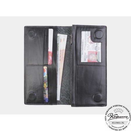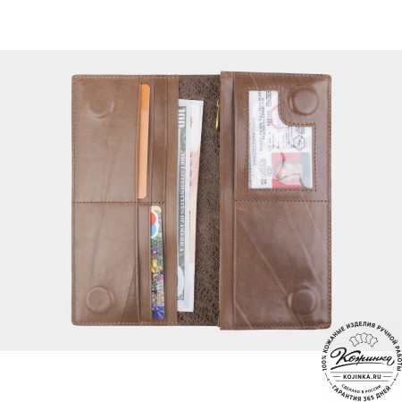 Портмоне, как и вся коллекция, выполнено в мягкой, но достаточно толстой коже высокого качества. Фиксируется в закрытом состоянии на хлястик с кнопкой.