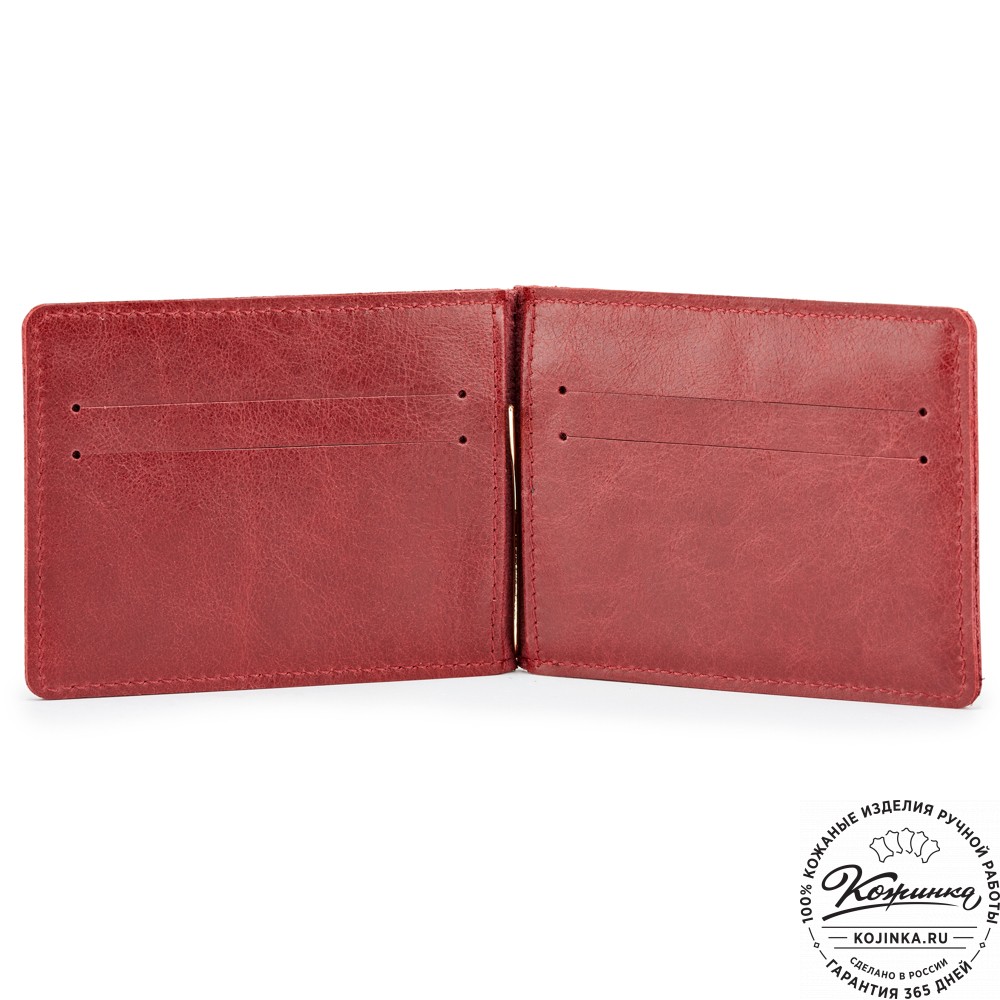 Зажим представляет собой обложку из качественной натуральной кожи для денежных купюр. Купюры удерживаются в обложке с помощью металлического зажима удобной конструкции.