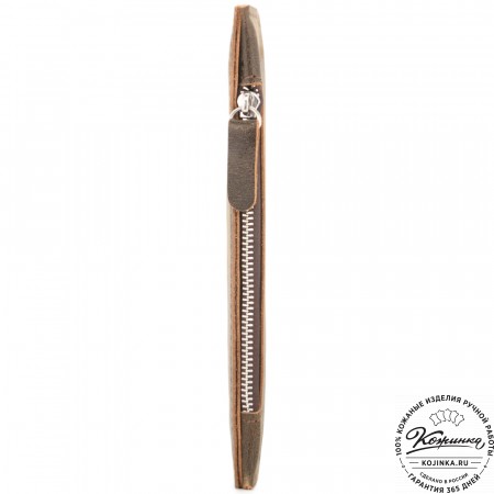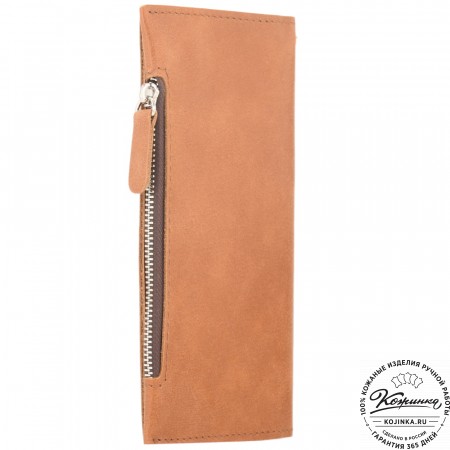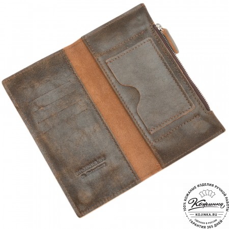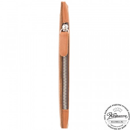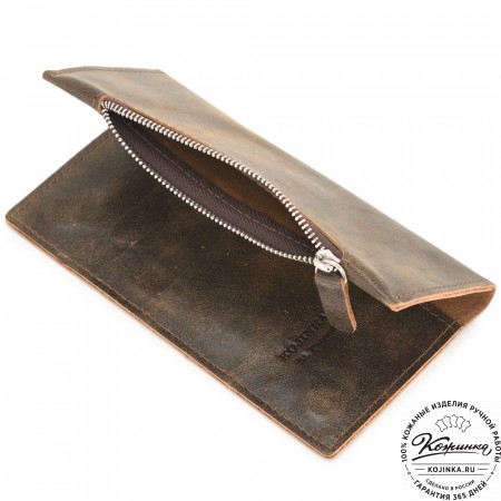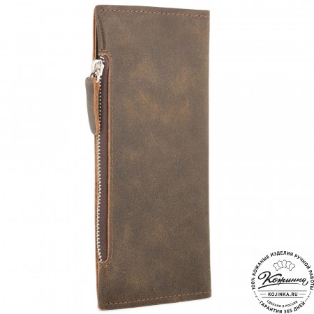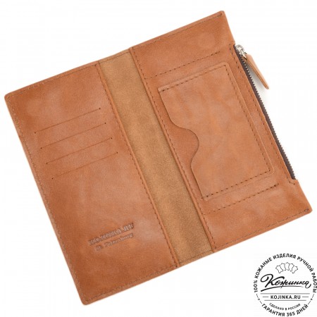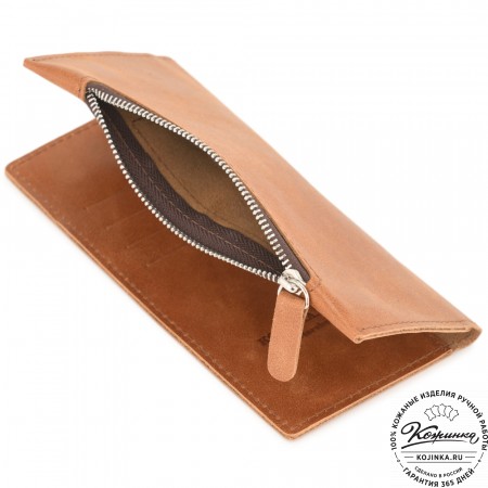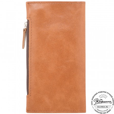 Портмоне, как и вся коллекция, выполнено в мягкой, но достаточно толстой коже высокого качества. Фиксируется в закрытом состоянии на хлястик с кнопкой.