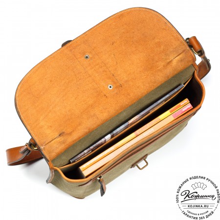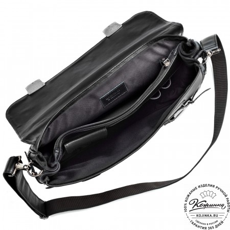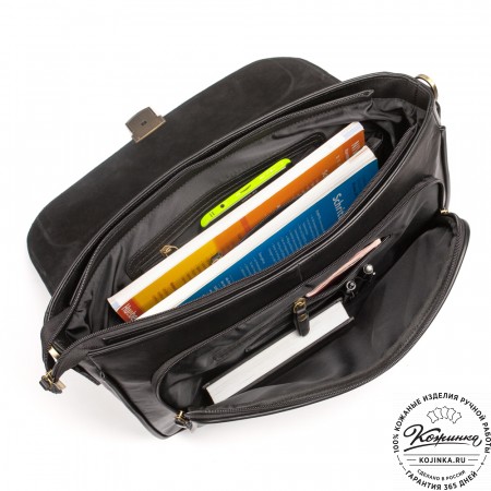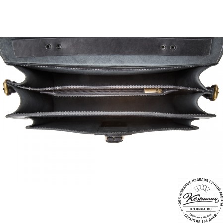 Внутри портфеля три отделения. Среднее из них закрывается на молнию.