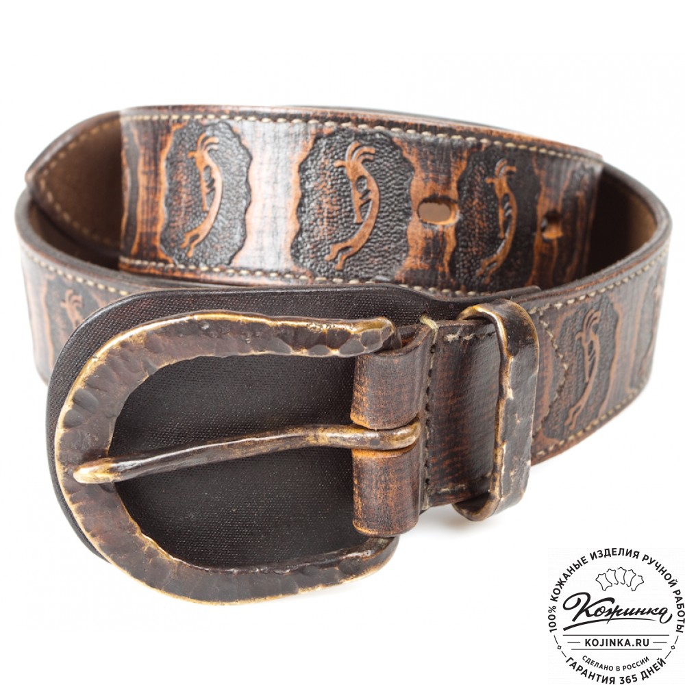 Толстая грубая шорно-седельная кожа высокого качества, удобная пряжка из латуни. По всей длине ремня выполнено оригинальное тиснение.