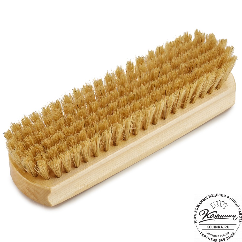 Щетка с натуральной щетиной используется для деликатного очищения изделий из натуральной кожи от пыли и загрязнений.