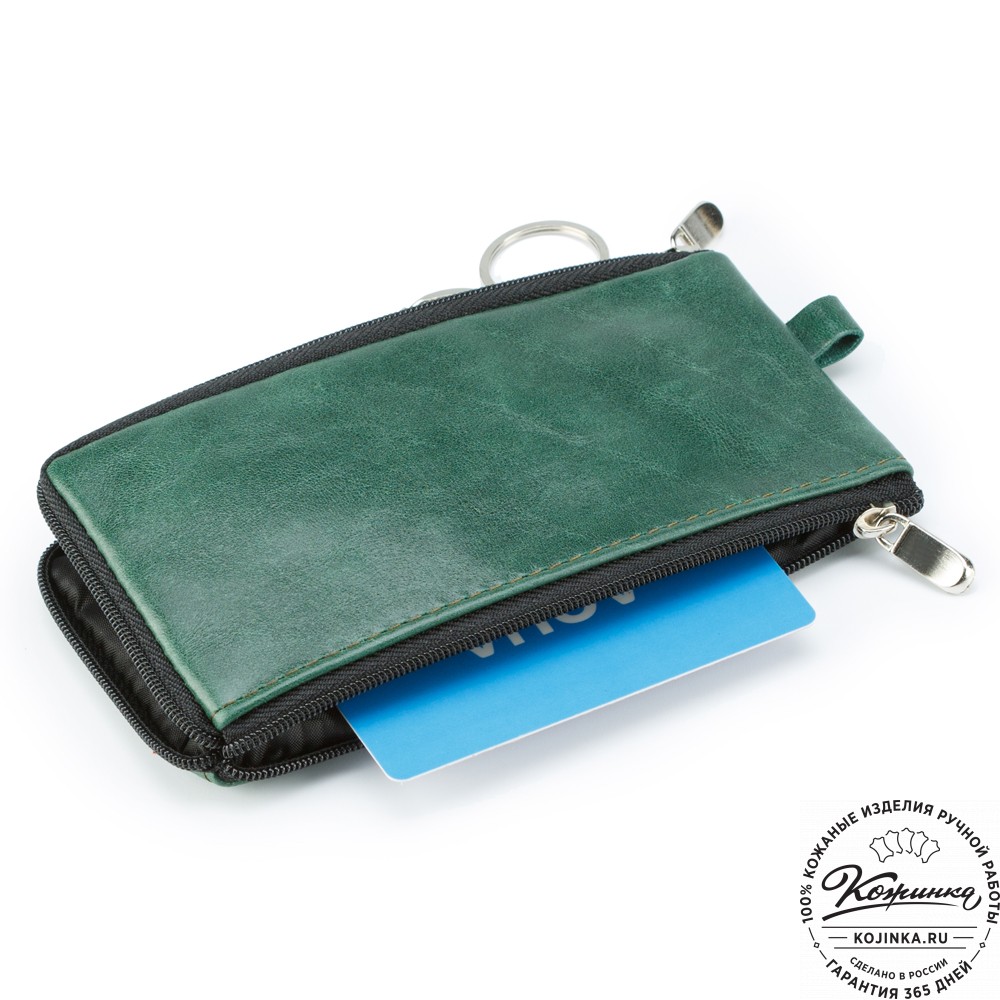 Кожаная ключница "Шанхай" (зелёная) – большая удобная ключница с дополнительным кармашком на молнии.