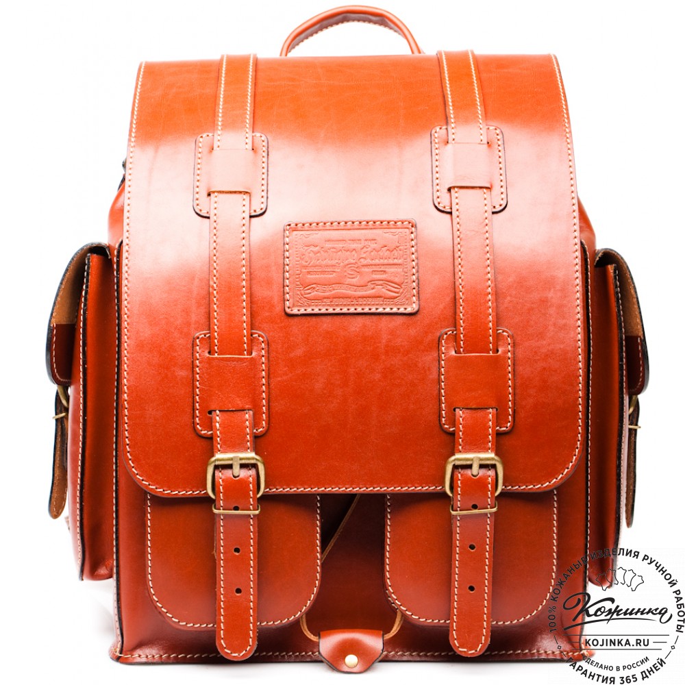 Внутри одно вместительное отделение, с кармашком на молнии. На наружной части два объёмных накладных кармана на липучках. Ещё два объёмных кармана по бокам на классических замках. Крепкие удобные регулируемые лямки. Рюкзак выполнен из толстой жёсткой кожи.
